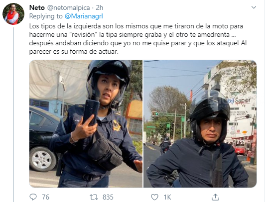 “Amigos ayúdenme con un RT una patrulla de la CDMX nos paro sin motivo alguno. Vengo con mi hijo, mi esposo y estoy embarazada. Una mujer quería revisar mi bolsa al decirle que no, se me subió encima y me golpeó”, se puede leer en el tuit acompañado de cuatro fotografías de la patrulla involucrada.