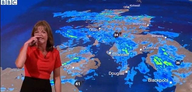 La presentadora de la cadena BBC, Louise Lear, tuvo un ataque de risa en medio del segmento en el que daba el pronóstico del clima.