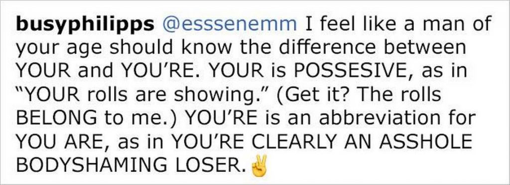 “Creo que un hombre de tu edad debería saber la diferencia entre ‘your’ y you’re’. ‘Your’ es posesivo, como en ‘tus rollos se asoman’ (¿Entiendes?) Los rollos me pertenecen). ‘You’re’ es una abreviación de tú eres, como tú eres una idiota Y UN PERDEDOR QUE QUIERE HACERNOS SENTIR VERGÜENZA DE NUESTRO CUERPO”, respondió Phillips., hecho que fue aplaudido por sus seguidores.