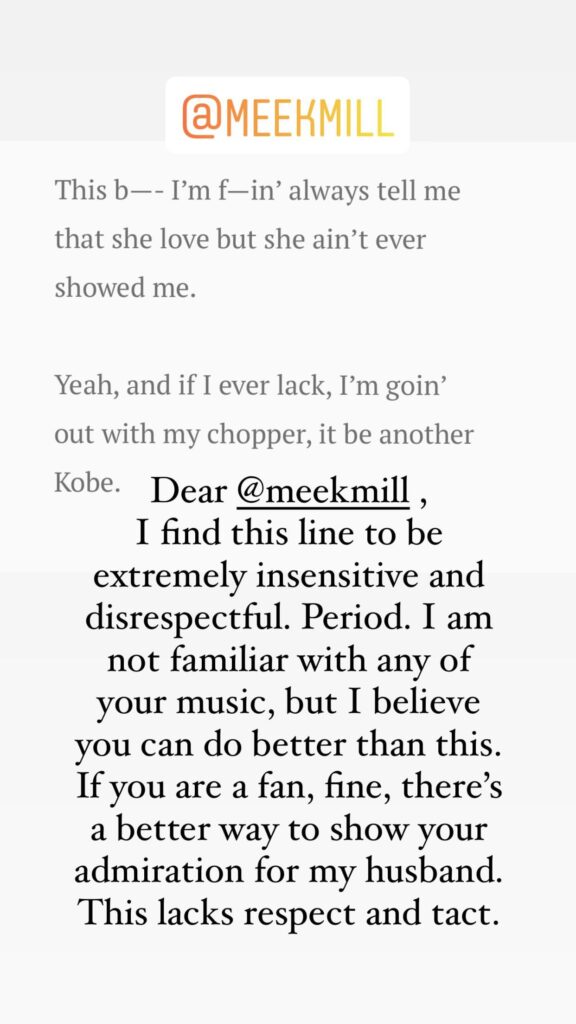 “Querido Meek Mill. Encuentro esta letra extremadamente insensible e irrespetuosa. No estoy familiarizada con tu música, pero creo que puedes hacerlo mejor que esto. Si eres fan, está bien, pero hay una manera mejor de mostrar tu admiración por mi esposo. Esto carece de respeto y de tacto”, se lee al pie de una historia en su cuenta de Instagram.