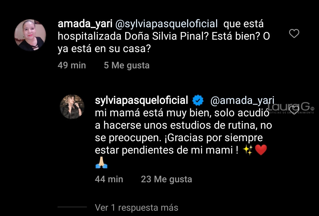 Además en su última publicación de Instagram, la actriz Sylvia Pasquel volvió a confirmar el estado de salud de su mamá en la sección de comentarios respondiendo a una de sus seguidoras.