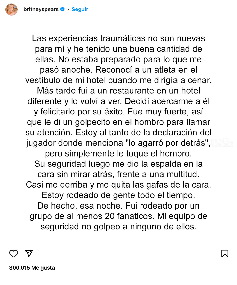 Sin embargo, el video obtenido por TMZ contradice la versión del jugador de baloncesto. En las imágenes captadas por un teléfono celular, se puede observar claramente cómo Britney Spears se acerca al jugador por detrás, pidiendo disculpas, momento en el cual el guardaespaldas Damian Smith la golpea en la cara con su brazo. La grabación también muestra la reacción de las personas presentes, entre ellas el esposo de Spears, Sam Asghari, quien corre hacia Smith tras presenciar la agresión.