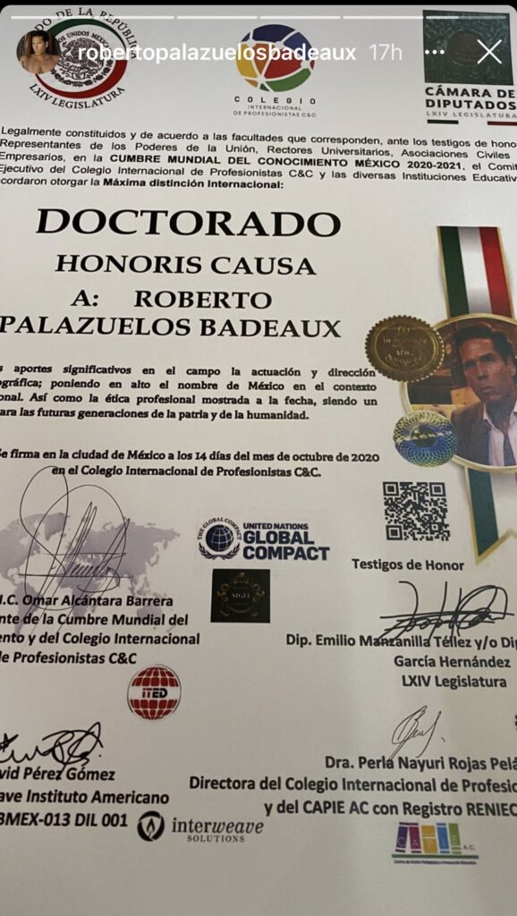 El actor y empresario compartió con sus redes sociales que fue reconocido con el Doctorado Honoris Causa por el Colegio Internacional de Profesionistas C&C, durante la Cumbre Mundial del Conocimiento 2020-2021.