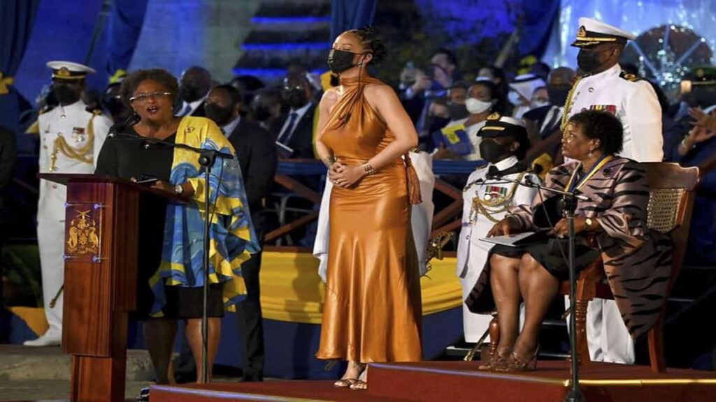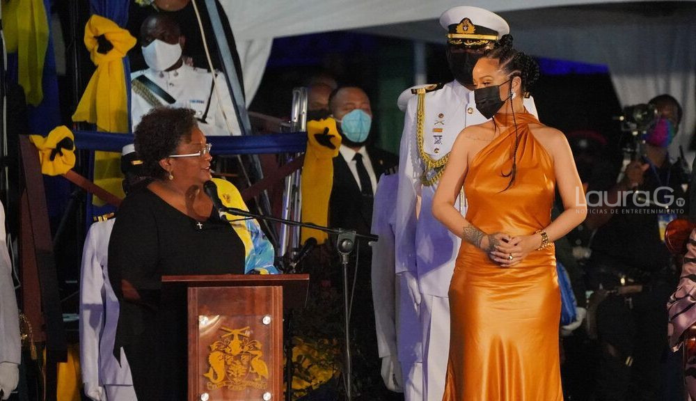 Los medios que estuvieron presentes en la ceremonia en la que el príncipe Carlos reconoció la independencia de Barbados , aseguraron que la barriga de Rihanna es notoria