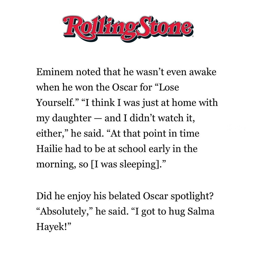 En la continuación de la publicación Salma escribió; “Pero estaba muy decepcionada de haber hecho el ridículo al conocerlo… y luego leí esto en Rolling Stone. Eminem eres grande”, y es que en su entrevista con la revista Eminen confesó que quería abrazar a Salma por el gesto que tuvo con él.