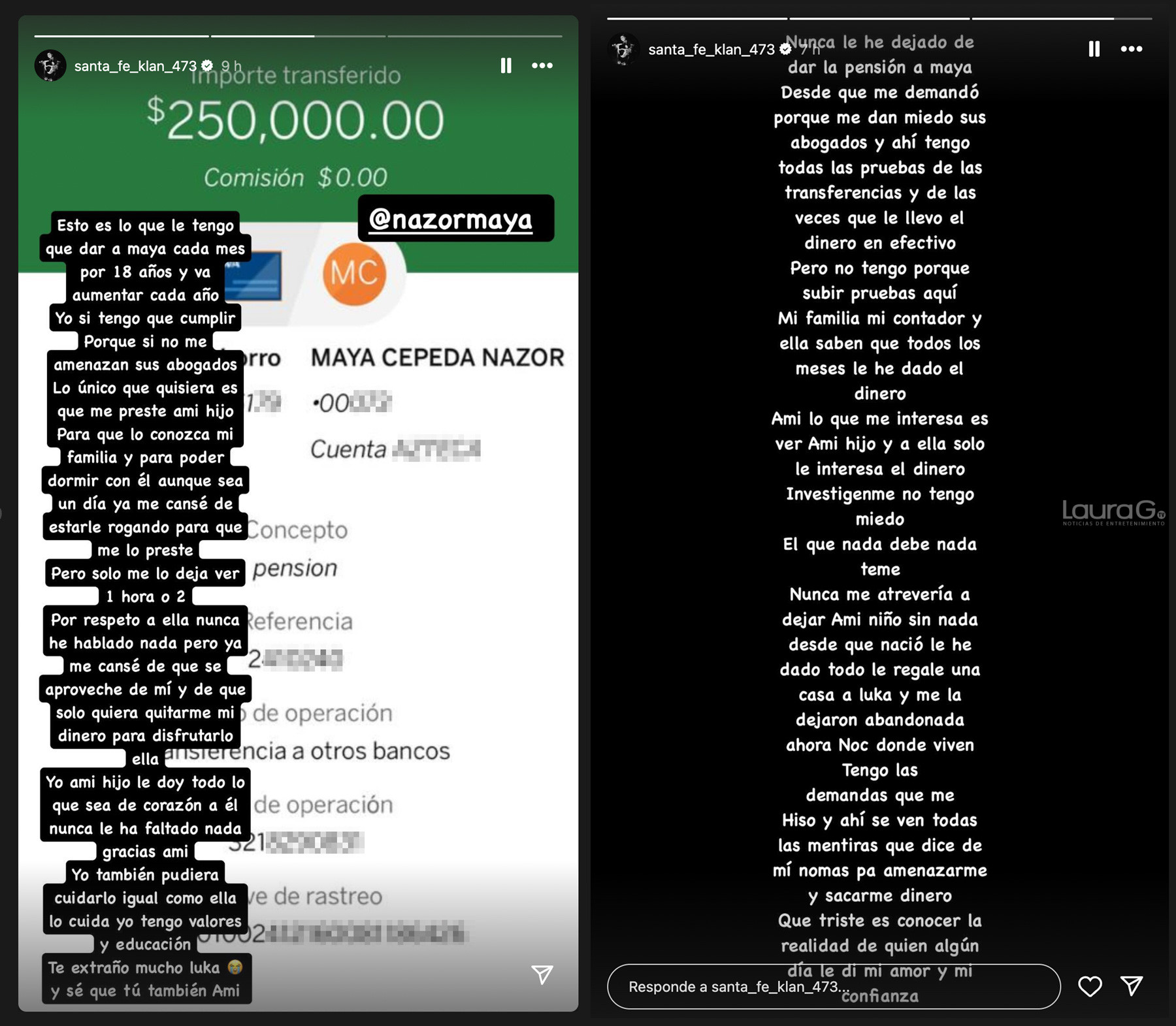 La tensión entre Maya Nazor y Santa Fe Klan ha alcanzado un nuevo nivel, luego de que ambos utilizaran sus redes sociales para compartir detalles sobre su disputa familiar relacionada con su hijo Luka. Las declaraciones de ambos han dejado en evidencia acusaciones mutuas que van desde incumplimientos hasta señalamientos de violencia económica y temores por la seguridad del menor.