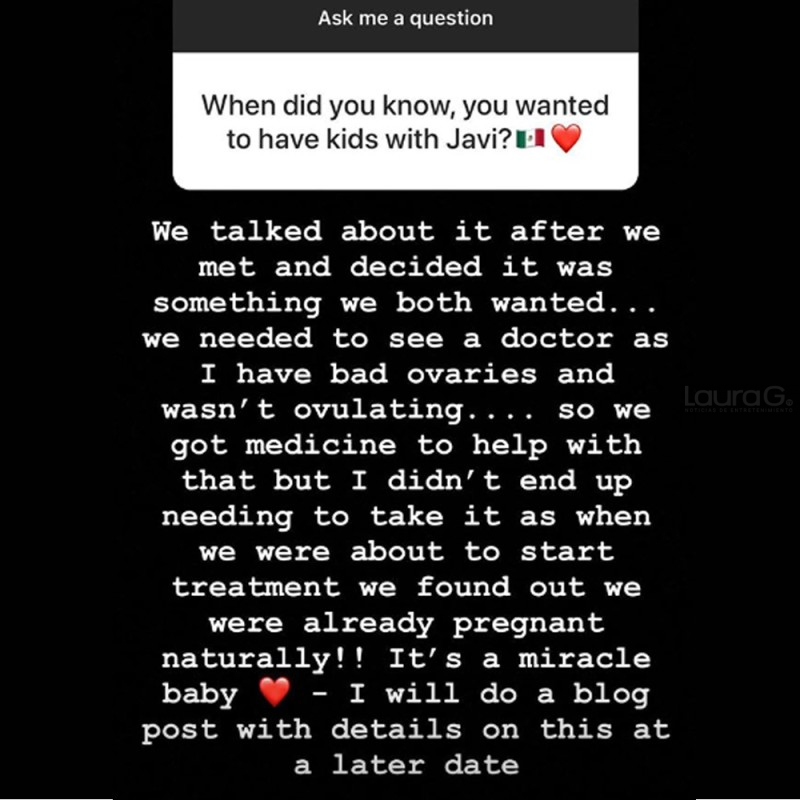 Un fan le preguntó: “¿Cuándo supiste que querías tener hijos con Javi ?”, Sarah respondió: “Hablamos de eso luego de conocernos y decidimos que era algo que ambos queríamos. Necesitábamos ver a un doctor porque tengo malos ovarios y no estaba ovulando. Así que conseguimos una medicina que nos ayudaría con eso, pero al final no la necesité porque cuando íbamos a empezar el tratamiento descubrimos que ya estábamos embarazados de manera natural. Es un bebé milagro”, comentó la modelo.