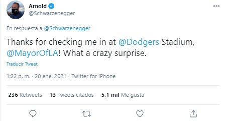 A través de su cuenta de Twitter también agradeció al alcalde de Los Ángeles, Eric Garcetti, por su registro en la lista de Dodgers Estadio, lugar en el que le aplicaron la vacuna.