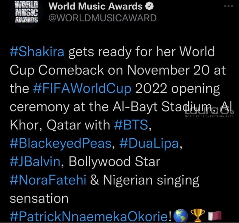 En el tuit además de Shakira se lee el nombre de Dua Lipa, asi como la agrupación de K-pop BTS, la banda estadounidense de hip-hop Black Eyed Peas, el reguetonero J Balvin, la cantante canadiense Nora Fatehi y el compositor nigeriano de reggae-dance Patrick Nnaemeka Okorie.