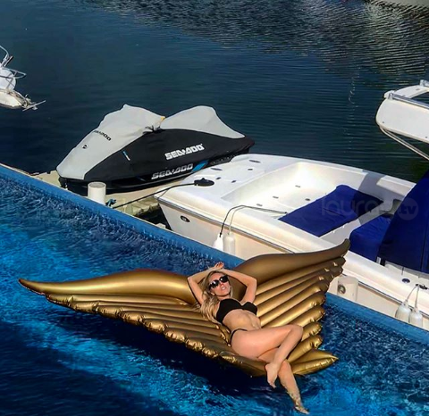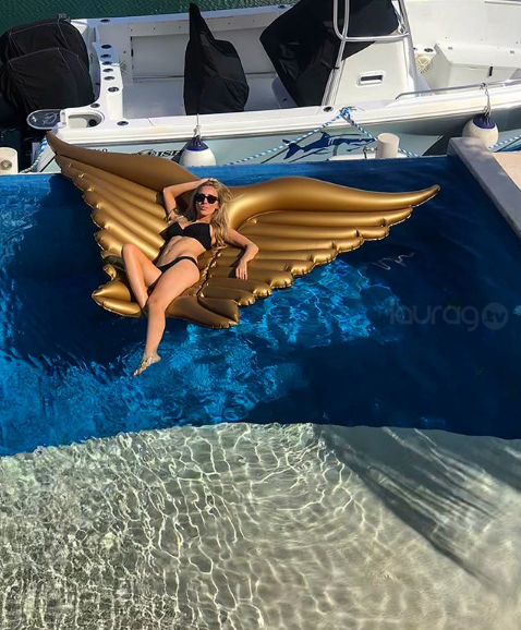 En las fotografías aparece recostada en un inflable de alas dorado.