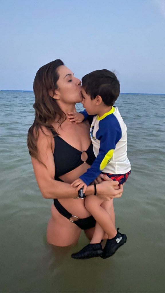 A través de su cuenta de Instagram, la conductora compartió una fotografía junto a Pato desde la playa, ahí modelaba un traje de baño negro, que resaltaba su figura y la felicidad, de compartir un íntimo momento con su hijo.