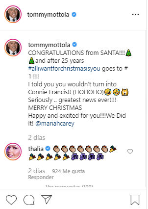 “¡Felicidades de parte de Santa! ¡Y después de 25 años “All I Want for Christmas is You” está en el número 1! ¡Te dije que no te convertirías en Connie Francis! (HOHOHO). En serio… ¡es la mejor noticia! ¡Estoy feliz y emocionado por ti! ¡Lo hicimos!”, fue el mensaje que escribió Mottola, recordando a la cantante que lanzó un disco navideño en los años 60.
