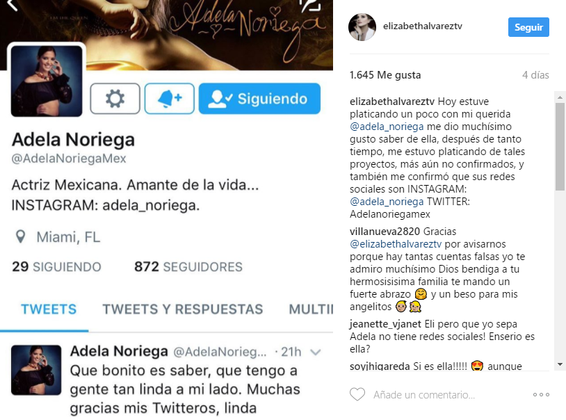 Incluso esta cuenta se valió de otra falsa en Instagram según pertenece a Elizabeth Álvarez y en esta escribieron un tuit para darle veracidad a las cuentas: “Hoy estuve platicando un poco con mi querida @adela_noriega, me dio muchísimo gusto saber de ella, después de tanto tiempo. Me estuvo platicando de tales proyectos, más aún no confirmados […]”.