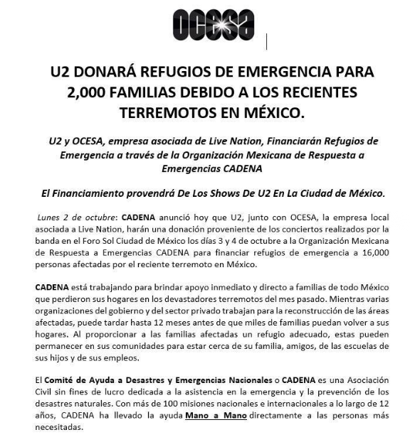 Fue a través de un comunicado de prensa emitido por OCESA que se difundió este apoyo que U2 realizará en conjunto con la empresa Live Natión, encargada de promover los dos conciertos de la banda en México, a través de la Organización Mexicana de Respuesta a Emergencias Cadena.