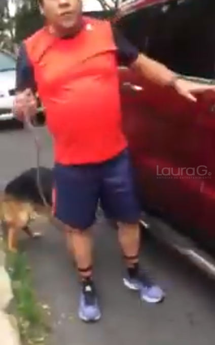 Finalmente el hombre se bajó de la camioneta tras la presión que ejercieron las mujeres y caminó junto al perro.
