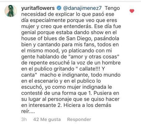 “Tengo necesidad de explicar lo que pasó ese día especialmente porque veo que eres mujer y creo que entenderás. Ese día fue genial porque estaba dando show en el house of blues de San Diego, pasándola bien y cantando para mis fans, todos en el mismo mood, yo platicando con mi gente hablando de ‘amor y otras cosas’ de repente escuché la voz de un hombre en el público gritando ‘cállate!! Y canta’ macho e indignante, todo mundo en el escenario y en el público lo escuchó, yo como mujer indignada le contesté de una forma que 1. Pusiera en su lugar al personaje que se quiso hacer el interesante 2. Hiciera a los demás reír”.